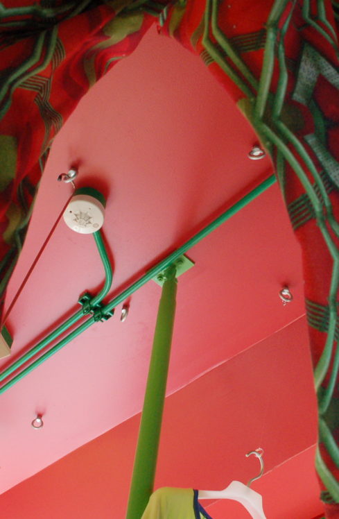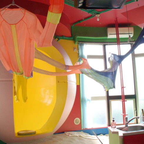 この展示&パフォーマンスは「三鷹天命反転住宅」の一室で行われました。この住宅は荒川修作+マドリン・ギンズが「家」「住む」事への全く新しいコンセプト(体に負荷をかける家に住むことで体が元々持っている可能性をよみがえらせる)によって、今までの建築では考えられなかった形体や色を家という形へ昇華させたものです。